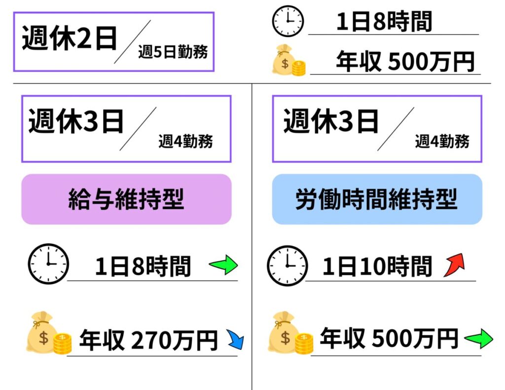 労働時間維持型(週40時間型)…1日の労働時間を増やし総労働時間を維持する働き方。週5勤務の場合と給与は変わらないが、1日当たりの労働時間が増加する。